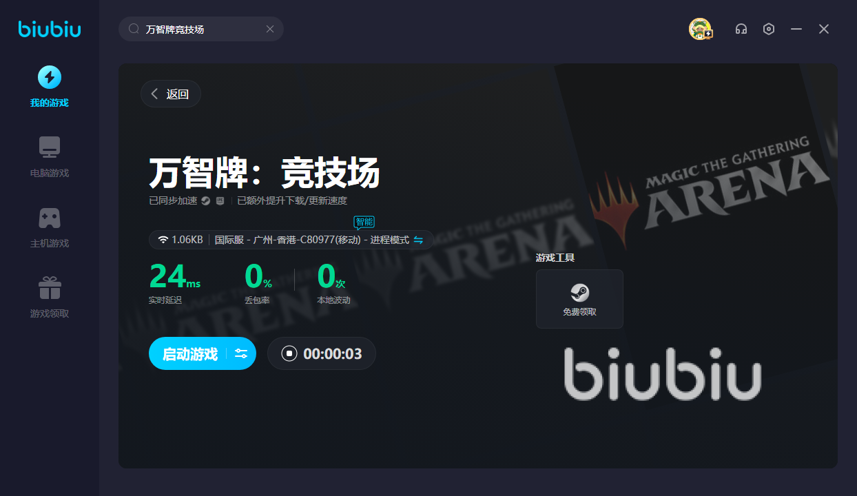 万智牌中的竞技场来自于其他地区,所以目前暂时还没有国服。要是想加入全新的卡牌竞技场,大家需要使用biubiu。有效加速以后,才能打开进入竞技场的大门。没玩过的朋友,可以通过新人领取24H的免费加速福利试玩一波。另外新老用户都可使用【biubiu不卡顿】,即可继续获取三天免费加速,继续嗨玩享不停。要是决斗途中卡顿的话,那就不能看清对方的卡组以及所出卡牌。有了加速器后,即可轻松掌握战斗节奏,不错失任何一个细节。