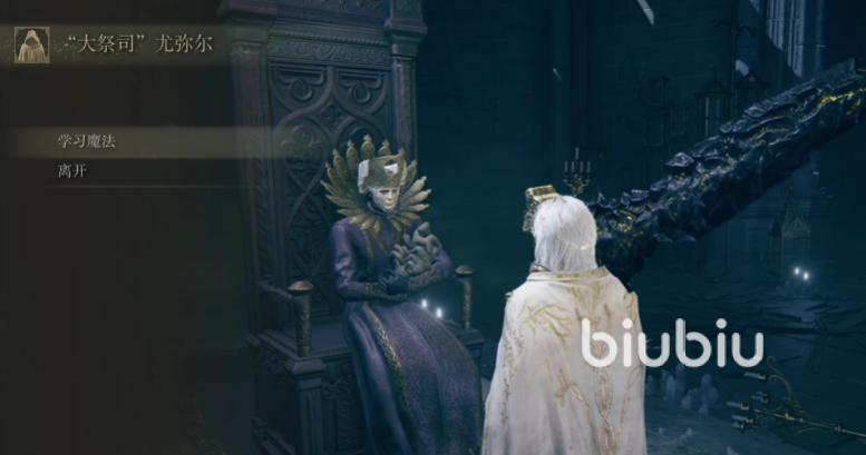 继续深入这片区域,会看到中间的破败建筑里面有一个王座,里面坐着大祭司尤弥尔。在这里是可以找他学习魔法的,并且还可以得到敲响遗迹大钟的方法。