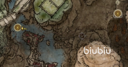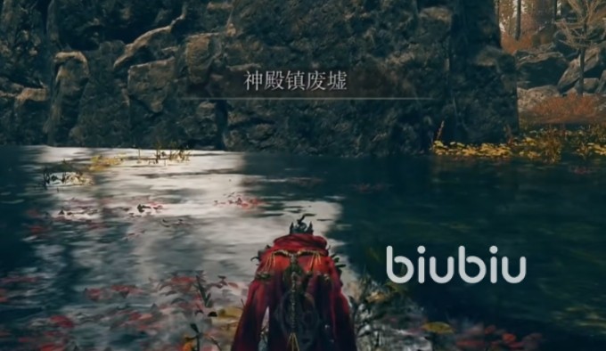 首先需要来到神殿镇废墟这里,穿过眼前的水域,然后往东边走,一直涉水走到岸上,找到山脚边上的一个大树那里,具体的位置小编已经在下图用白色光标标注出来了。