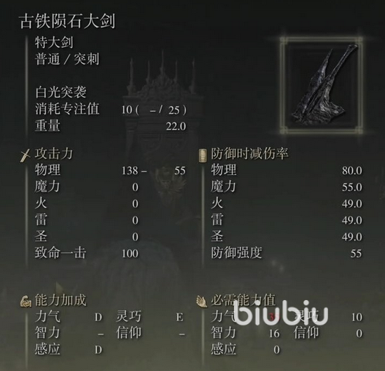 这把武器的能力值也是比较不错的,具体数值如下图所示,它的物理攻击力是138,致命一击是100,而它的防御属性也是很不错的,物理减伤率能达到80,魔力的减伤率能达到55,自带技能白光突袭,此外它对于力气和感应的加成是D,而对于灵巧的加成则为E,作为过渡使用还是可以的。