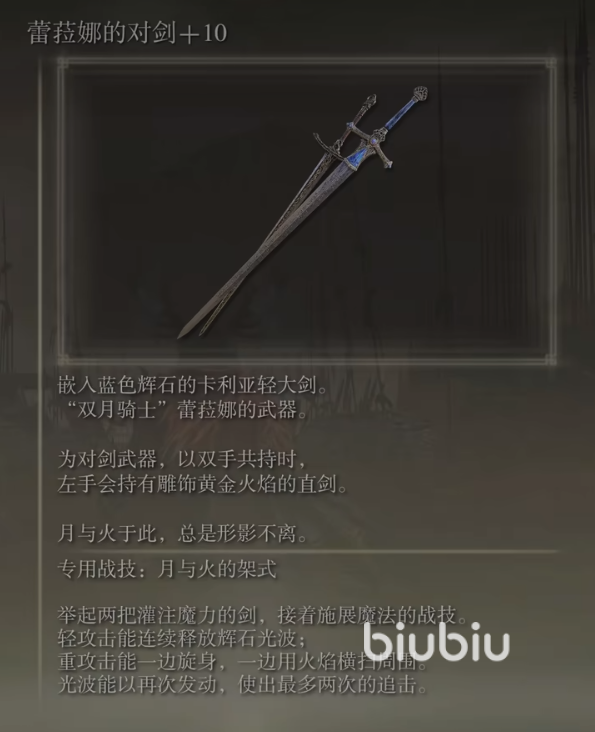 玩家在游戏中必然会与蕾菈娜有一场战斗后,在击杀之后就能得到她的武器,简单来说这就是平常说的“双刀”,需要玩家双持。两把剑分别会自带火焰以及月光特效,在颜值方面可以说是拉满,自带战技火焰横扫和月光辉石斩击。
