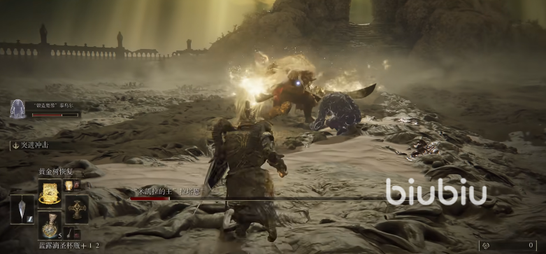 玩家仅需要保证自己有足够的蓝瓶补给和治疗技能,之后直接在BOSS房召唤泰乌尔然后开始观战,这个帮手会自己和BOSS打起来。一般来说boss都会从正面进行攻击,而魔像泰乌尔一反常态,正面有减伤效果,想要造成伤害就必须从背面才行。另外它也是一个不会进入硬直的召唤物,玩家只要在召唤物血量告急时给它治疗一下,它又可以持续作战很久,玩家只需看它和BOSS进行“赛博斗蛐蛐”就行,有了玩家的加血毫无疑问也是必胜的。