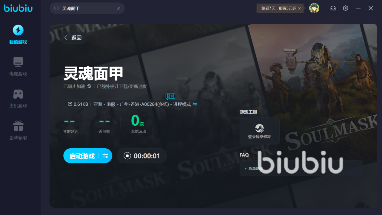 灵魂面甲游戏中玩家将来到一个比较陌生的土地,而在土地上玩家需要去寻找各种生存类的资源,建造出一个基础的家园,然后通过家园的庇护寻找生存的食物,学习强大的战斗技能,从而为自己的家园建立名声,之后便是提高家园的生完,收纳更多的人才,养成体验是比较完整的,但是部分玩家想要联合其他玩家一起建造家园,但是无奈网络太卡,导致建造家园的速度大大降低,用biubiu加速器来保证网络的流畅吧,并且新人在注册后便获24小时免费加速,以及新老用户使用兑换码【biubiu不卡顿】可获3天免费的使用权哦!