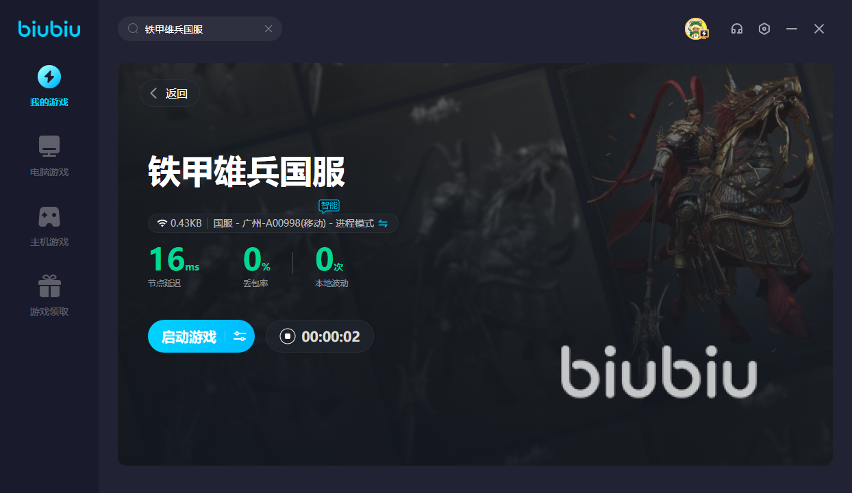 铁甲雄兵国服中的战争场面特别写实、恢弘,没有好的网络很难还原出这种真实的战争体验。使用biubiu之后,才能让你勇于开启最高画质,享受这乱世战争的刺激战斗!没用过的朋友,可以通过新人领取24H的免费加速福利,先体验一下。另外新老用户都能使用【biubiu不卡顿】,即可畅享三天免费加速。在好的网络下,方能开启绝世战争!如果在战斗的途中太卡顿的话,有可能导致画面撕裂、模糊,同样无法决斗!使用加速器后,就能无惧各种意外情况,尽情地指挥军队决战!