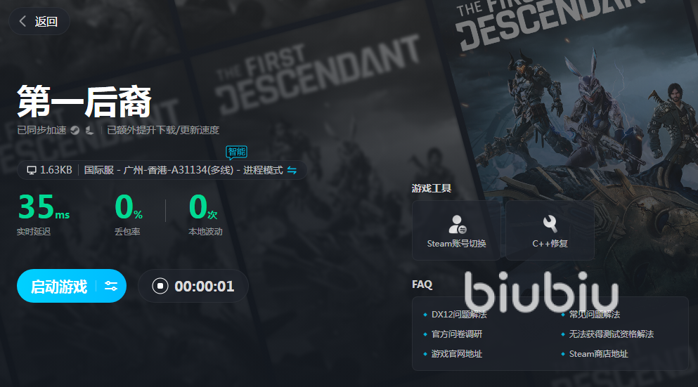 大家会在游戏内遇到成群的敌人,我们要单人或者和队友们一起战胜它们,但是网络的卡顿会让我们无法正常进入对局,从而拖了队友的后退。遇到这个问题的时候大家也不用着急,使用了biubiu加速器以后就能解决问题了。它能够自动识别游戏,并提供最佳的加速方案,确保玩家在《第一后裔》中获得流畅的网络体验。