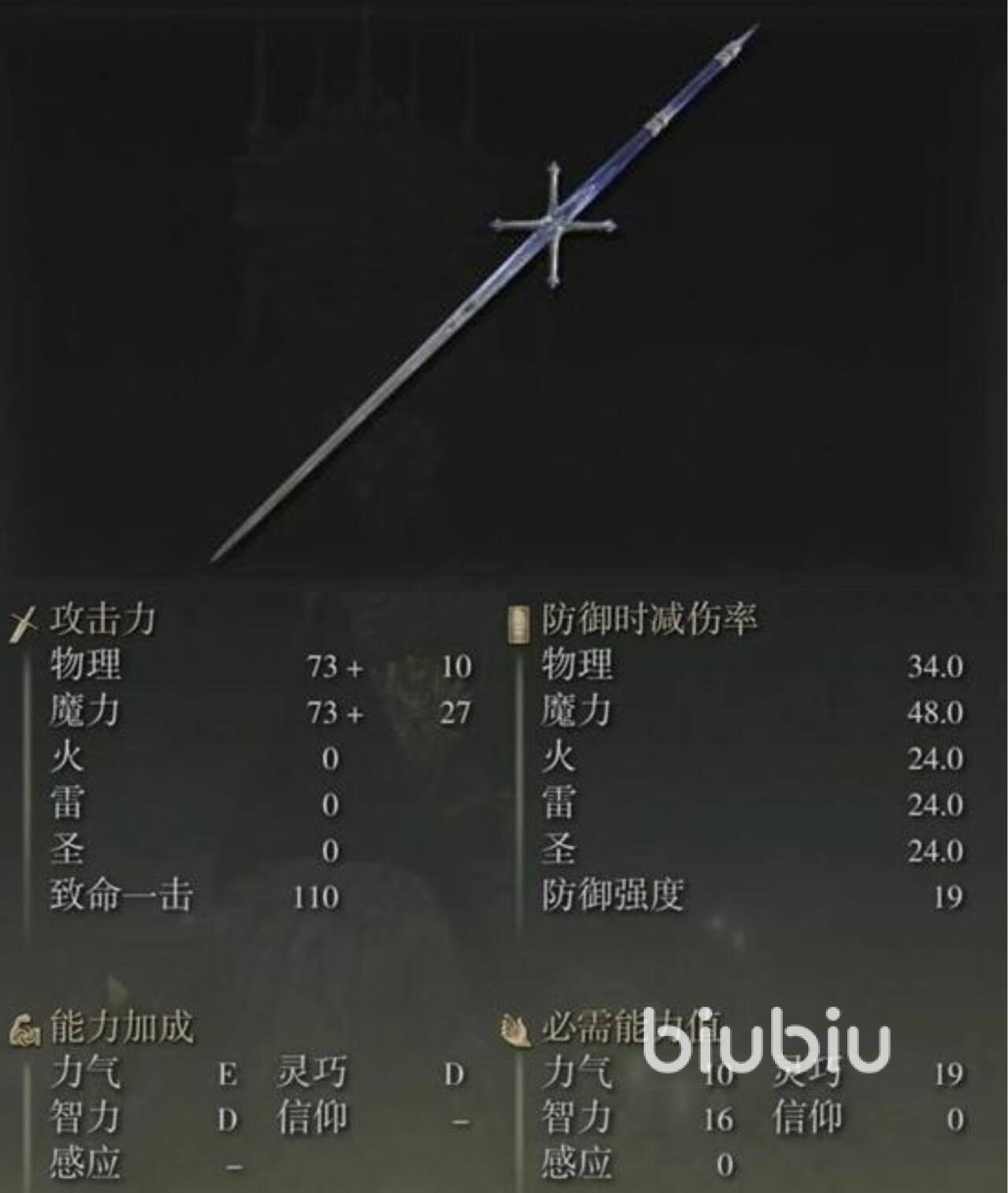 这是卡利亚王室使用的一把辉石剑,外观上看起来这是一把拥有细长剑身的小型刺剑,专属的技能叫做贯穿,是能够蓄力向前突刺的效果,并且还能附带破防的效果。此外它的各方面属性都比较均衡,比如魔攻和物攻的加成都是73,致命一击的数值为110,对智力和灵巧方面的加成也不错,更加详细的数值大家可以对照下图。