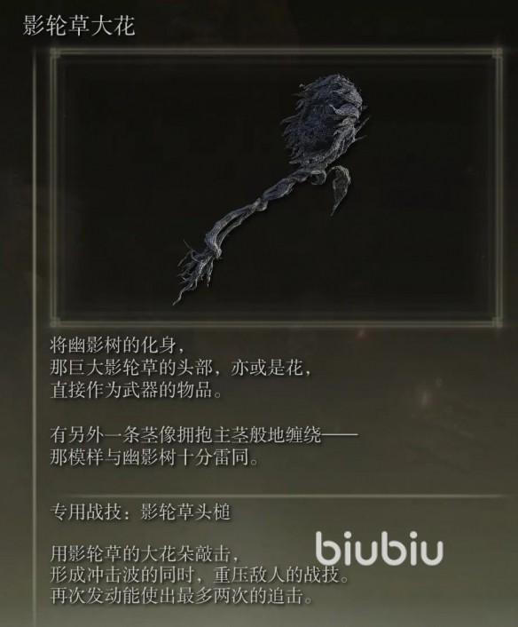 影轮草大花这把武器就是幽影树本体的一部分,如果你想攻击距离远威力大的近战兵器,这倒是一个不错的选择。战技可以让一些非霸体敌人发生硬直,并且会有冲击波压制敌人,再次发动还能进行额外的追击,即便玩家自己善于使用这把武器,带在身上让仿生泪滴作为你的复制体使用,也是个不错的选择。