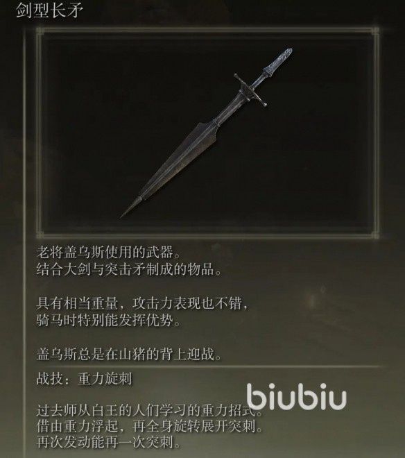 老将盖乌斯的剑型长矛,在分类上是一把大剑,虽然其貌不扬确实一把传说武器,玩家如果喜欢手感沉重但是攻击力高的武器,这是个不错的选择。另外技能的旋转突刺连段也非常适合追击,弥补了重型兵器的机动性,若你是刚玩魂游的新手,这种沉重的手感或许你会不太适应,需要多习惯一段时间。