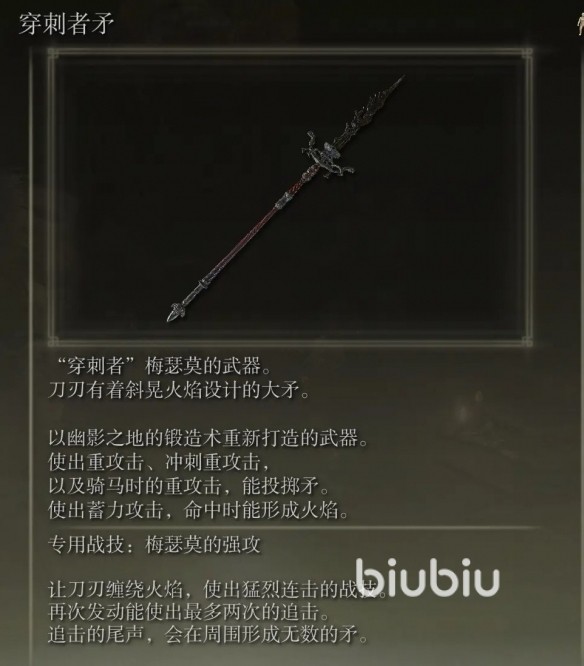 梅瑟莫的穿刺者矛非常值得去兑换,特别是在骑乘时可以通过重击投掷长矛,形成火焰。在地面使用时也可以暂时让刀刃缠绕火焰打出连击,最多允许有两次追击,并会在追击结束时形成无数的长矛,无论你是平常打BOSS还是骑着马去探索,这把武器都会有用武之地。