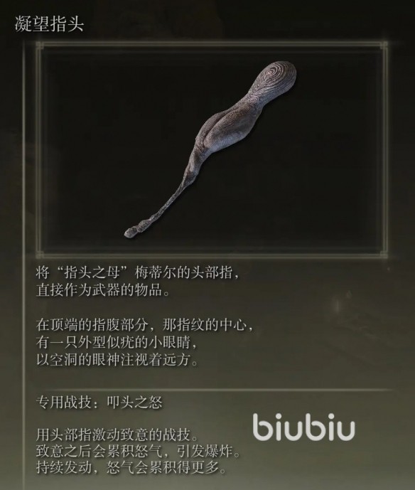 凝望指头是近战职业用的武器,战技会让玩家叠怒气并引发爆发,但实际上不太好用,因为实战时你根本没那么多闲暇去叠怒气层数,所以即便是不换也没什么损失。