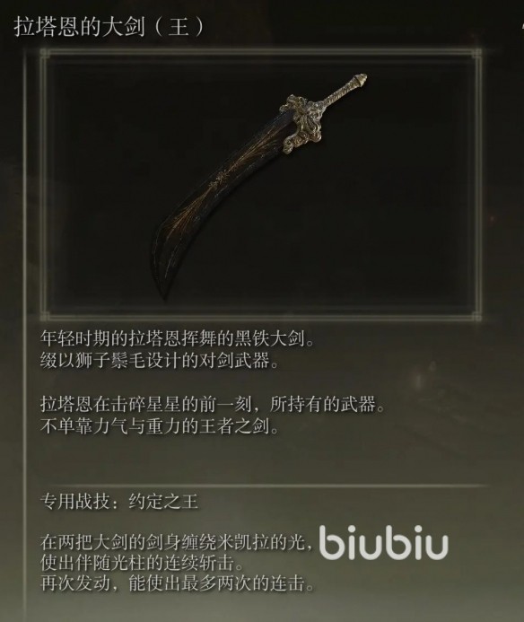 拉塔恩作为最终BOSS自然也会有追忆,你可以兑换BOSS使用的大剑中系列的一种,每一种都是对剑,也就是俗称的双刀。首先是拉塔恩的大剑(王),这个版本的对剑战技会暂时让玩家武器受到米凯拉的光之祝福,随后你可以伴随光柱发出连续斩击,最多可以追加两次连击。