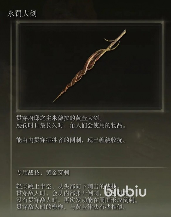击败癫火之王就能去兑换他的武器永罚大剑,这是开局BOSS从头部拔出来的武器,虽然过场动画中癫火之王十分恐怖,但这把武器却还挺好用。除了外观看起来比较拉风之外,这把大剑的战技也很好用,可以让角色跳起来使用武器贯穿敌人,伤害可观的同时高跳跃也能让你躲掉一些地面判定的技能,保自己一命。