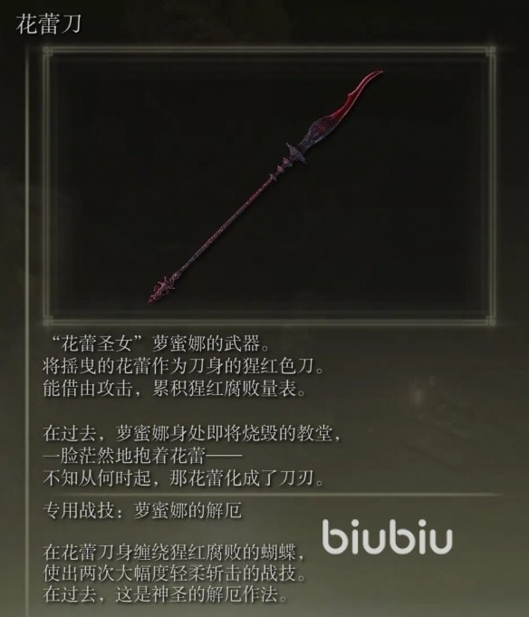 花蕾圣女罗蜜娜手上的那把花蕾刀,有着被猩红污染的外观,作为长刀攻击距离也相当不错,并且用起来也不是那么沉重。战技会让玩家发出两段具有蝴蝶特效的斩击,穿插在玩家的连招中也十分丝滑,在众多传说武器中,这把刀的手感显得相当不错,值得去进行兑换。