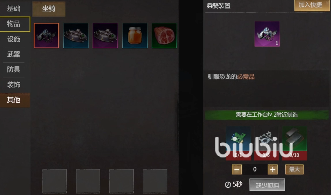 想要抓捕恐龙,我们首先需要打开制作台,点击进入其他,在这里能找到精密恐龙捕猎器、恐龙安定果酱和乘骑装置,根据下方的所需材料,将它们给制作出来,如果材料没有的情况下,大家可以点击缺少的材料,查看获取方式。