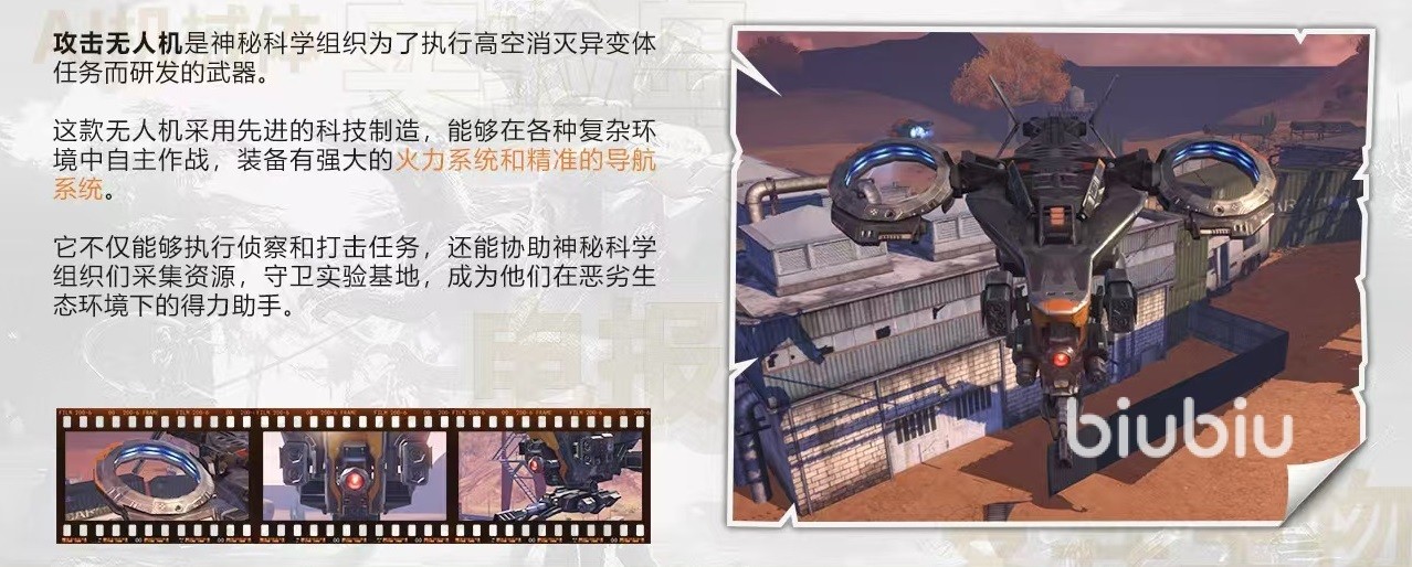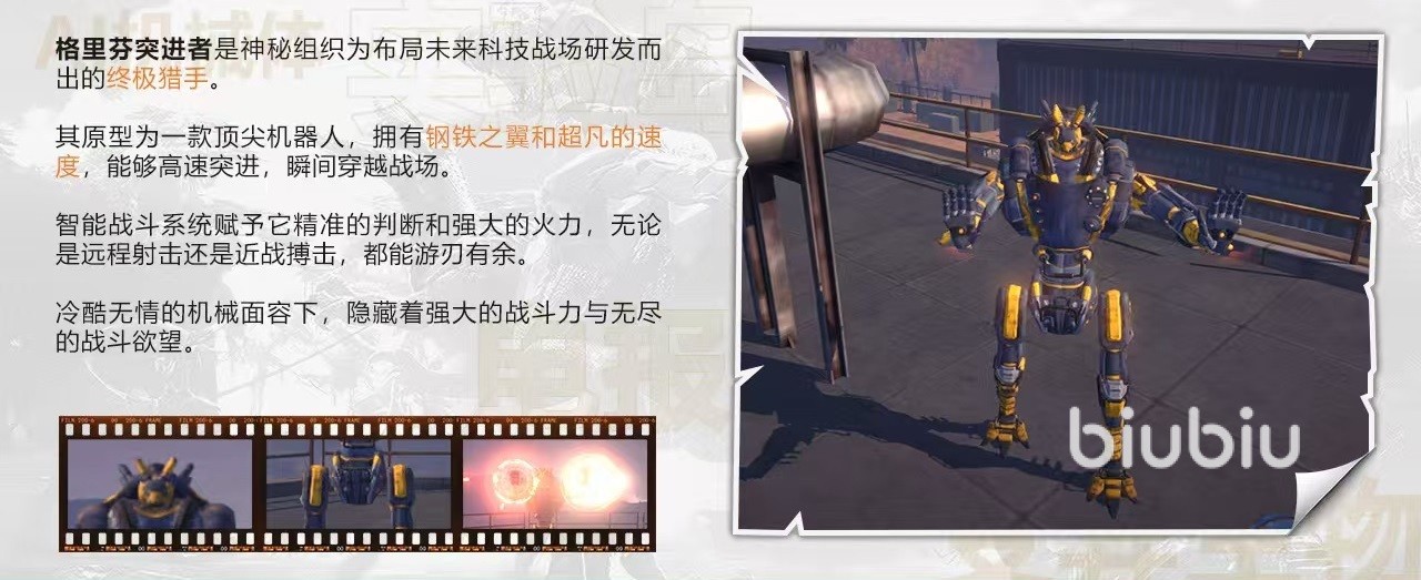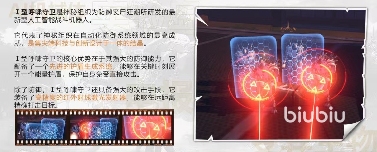 第1个是格里芬突进者,是一款顶尖机器人,拥有钢铁之翼和超凡的速度,能够在战场上高速推进,用智能系统带来了精准判断和强大火力,在远程射击和近战搏击方面都非常出色。第2个I型呼啸守卫,是为了防御丧尸狂潮所研发出来的人工智能战斗机器人,将各种尖端科技和创新结合起来,拥有强大的防御能力,配备了先进的护盾生成系统,可以展开能量护盾防御大量伤害,还具有高精度的红外射线激光发射器打击远处目标。