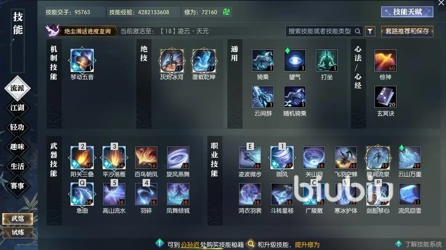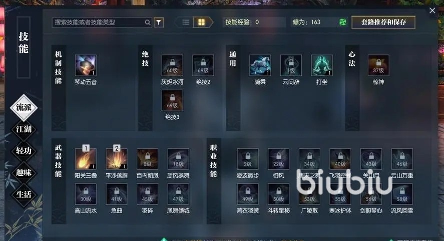 “关山月”,可以对敌人造成浮空效果,单体必备技能。“飞羽空蝉”,释放可得一个冰和火音符,副本必备技能。“碧涧流泉”,两段伤害,首先对敌人造成冰音波伤害其次是对扇形范围敌人造成伤害。“云山万重”,适合阻挡敌人进攻和后退,防守团必备技能。“鸿衣羽裳”,使用后可以增加内功的伤害,属于pve技能。
