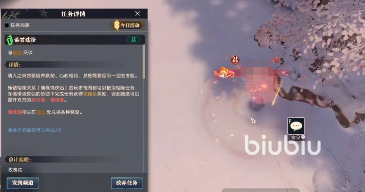 从名字可见,这是一个走迷宫的双人游戏。情缘双方可以任选身份,选择风筝就是指挥者,选择寻路就是走迷宫的人。风筝可以在天上看到整一个迷宫的全景与路径,走迷宫的人听从风筝的指引,前后左右移动,走到迷宫终点即为完成任务。这个走迷宫任务比较简单,因为迷宫地图不算大,而且有全程连麦听从指挥的金手指,直接走就能完成任务。