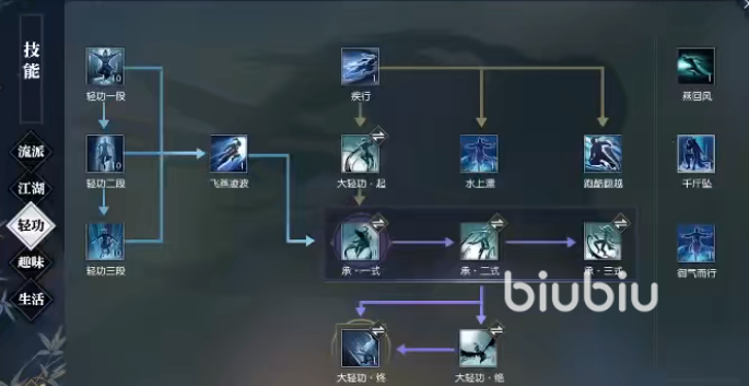 轻功系统基础的必学有轻功三段,玩家只要学习到轻功二段,才能激活后续凌波微步以及开启大轻功。根据玩家在不同平面上行驶的状态,有对应的技能:疾行可以在障碍物上跑酷连续使轻功,水上漂对应的就是在水面或者滑雪面,还有跑酷翻跃,可以跳过多个建筑物外墙、楼顶、树顶等。