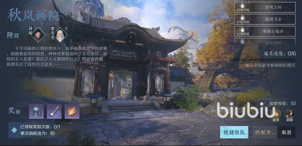 这一副本的开启等级是三十级,鉴于游戏前期升级的速度非常快,所以玩家基本上刚进入游戏的第一二天就能去挑战此副本了,秋岚画院的副本是可以组队进行挑战的,因此小编建议大家最好搭配好队伍,尤其是奶妈一定要带上,有了合适的队伍再去刷这个副本,这样通关的几率可以大大提升。