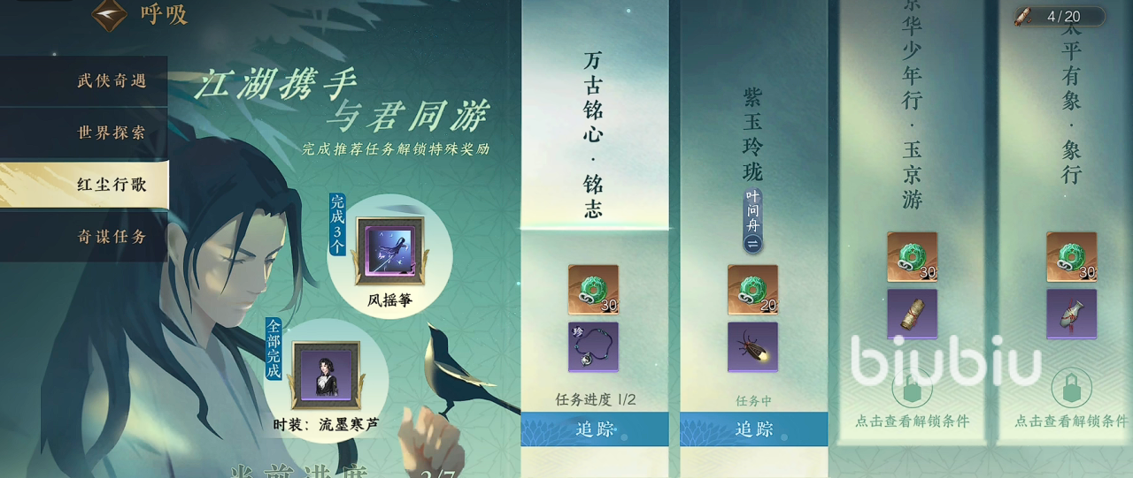 如果大家没有这个技能的话,小伙伴们则需要参与江湖推荐任务红尘行歌进行领取。当玩家们完成三个以上该任务之后,便可以领取到风筝摇技能,全部领取的话,还能获得一个时装。