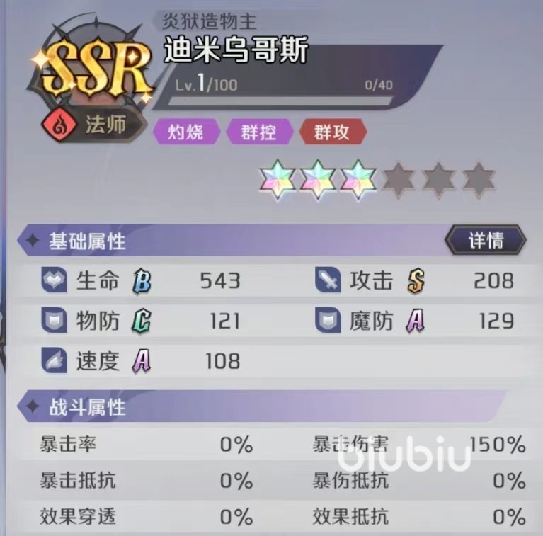 迪米乌哥斯主打灼烧效果,技能还带有群体控制,在前期的副本清怪中好用但是不突出,不过因为有送的SR雅儿贝德在,同样是群攻角色,因此就让迪米乌哥斯的抽取必要性降低了。