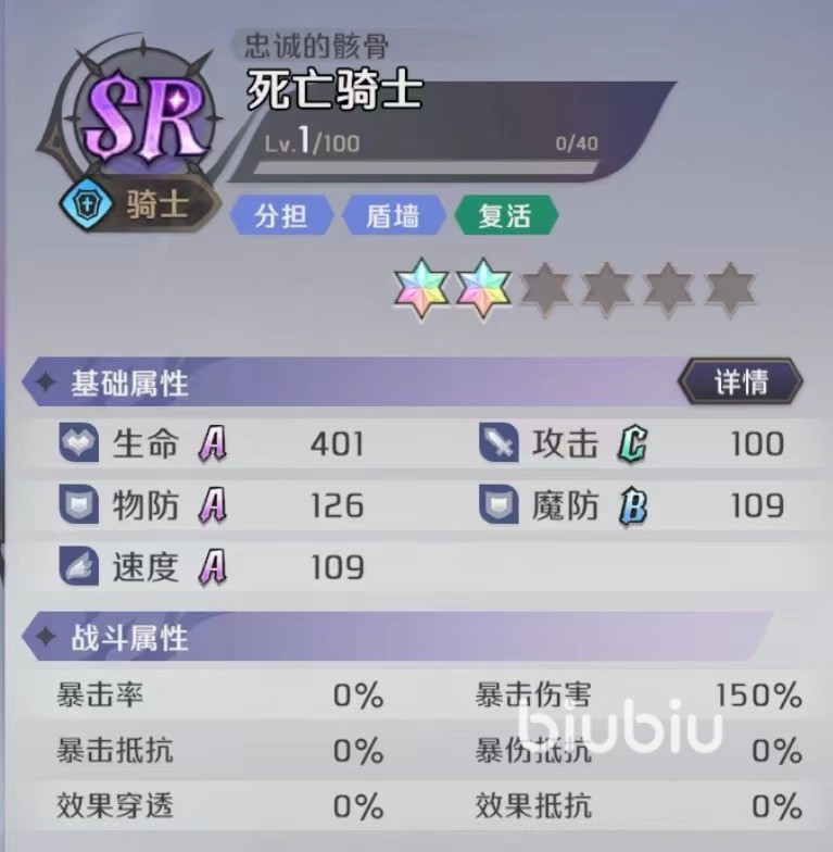 死亡骑士品质是SR,系统定位是骑士,主要作用可以替队友分担伤害、吸引仇恨,自己还有复活能力,虽然输出能力不行,但是作为一个肉盾已经具备十足的能力了,缺少前排的小伙伴可以培养,机制和由莉比较像,但是死亡骑士有自保能力,但是保护手段稍逊一筹。