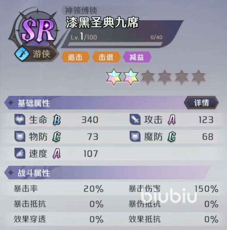 漆黑圣典九席是定位是游侠,比较有机动性的输出角色,基础属性只有攻击力和速度是A级,双防和生命值都偏低。