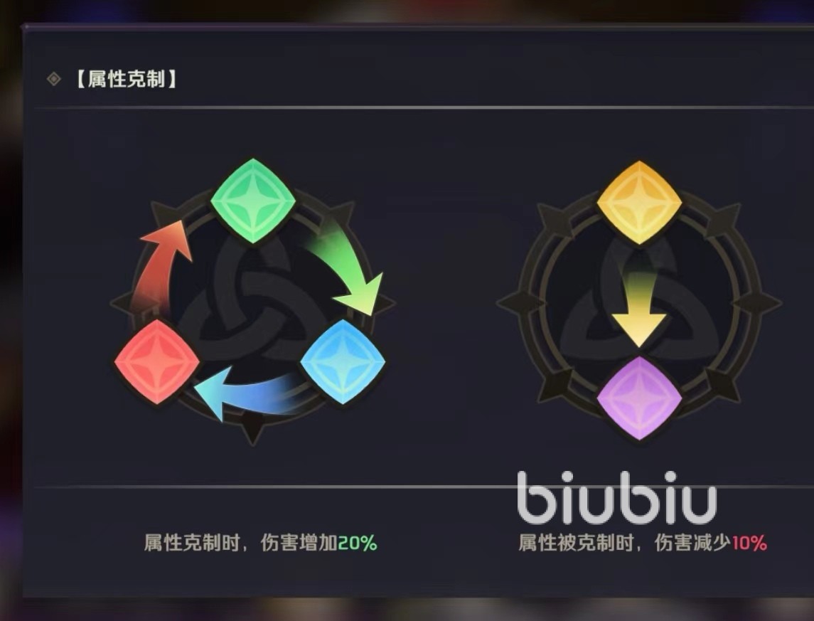 目前游戏中的属性总共有3种,属性分别是红绿蓝,三者之间相互克制,成一个循环,当自己的属性克制对方时,造成的伤害将额外增加20%,攻击目标的属性正好克制自己时伤害会减少10%。