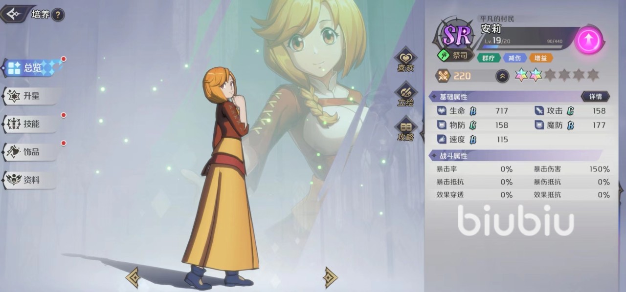 娜贝也是队伍中的输出角色,技能伤害面板也不低,通过击杀敌方单位还可以获得额外的分裂攻击效果,适用于清场收割。安莉是通关剧情时送SR奶妈,前期可以考虑培养,因为没有奶的队伍难度就大大提升了。由莉是队伍中的前排,承担抗伤的义务。