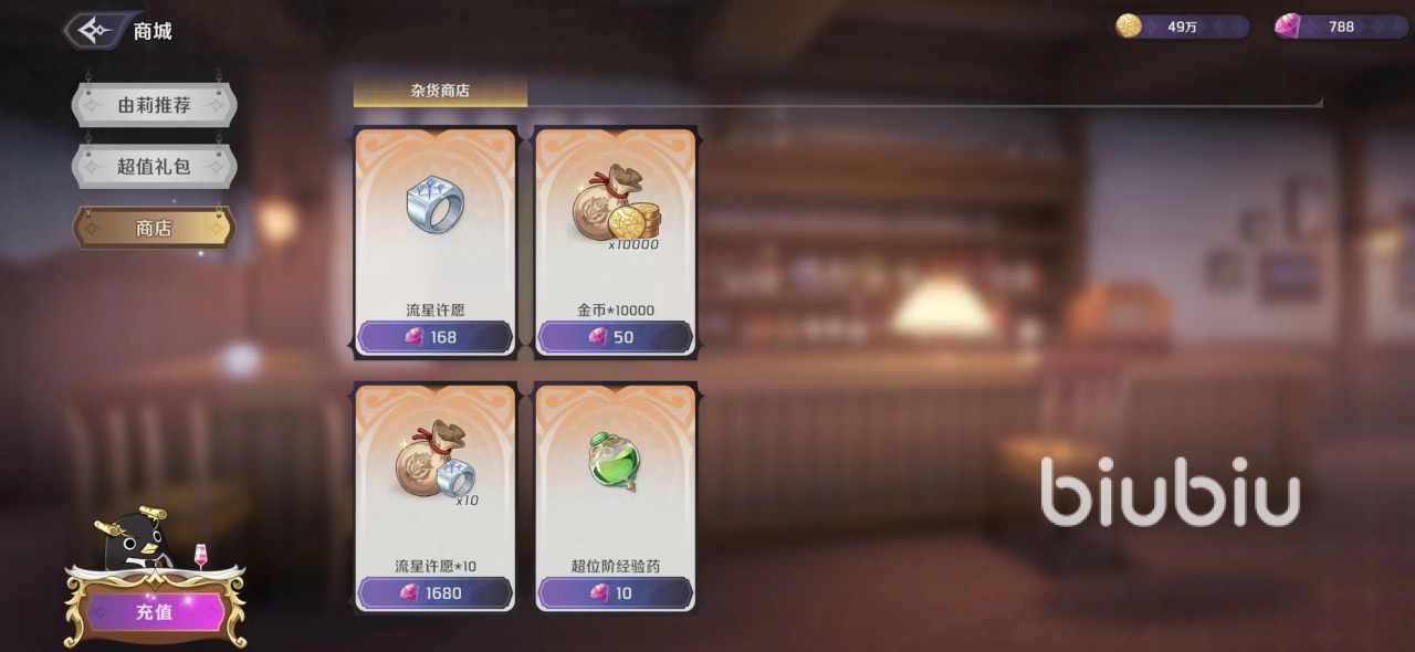 1.使用钻石魔导水晶购买,在由莉的商城中就可以看到超多不同的礼包,由莉推荐的每周限购就是金币袋,整体算下来是5折优惠,若是着急使用金币的小伙伴可以去普通商店选项,消耗50钻石获取1W金币