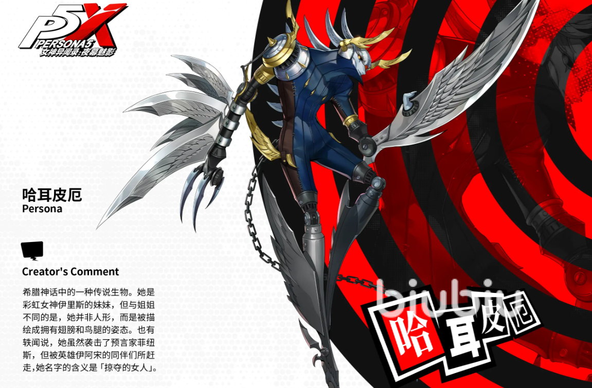 北里基良的人格面具是哈耳皮厄,会作为他的第二战斗形态登场,哈耳皮厄是希腊神话中的一种传说生物,她是彩虹女神伊里斯的妹妹,但是和姐姐不同的是,她并不是人形。