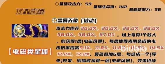 新井素羽晴光的专属武器是电磁类星体,它有着超高的攻击力加成。被动电磁风暴会对每个导电的角色施加。小编推荐大家可以试试触电暴击流,又新井素羽晴光加上yui和任意治疗角色yui负责增伤而素羽负责输出在配合治疗角色使得队伍除了遇到耐电角色以外,都有不错输出能力。