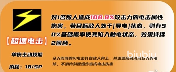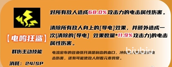 她的二技能和一技能互补是一个强力的单体伤害,她会对处于导电状态的敌人有概率陷入触电状态,触电可以使敌人额外收到百分之10的暴击伤害。
