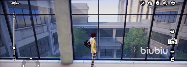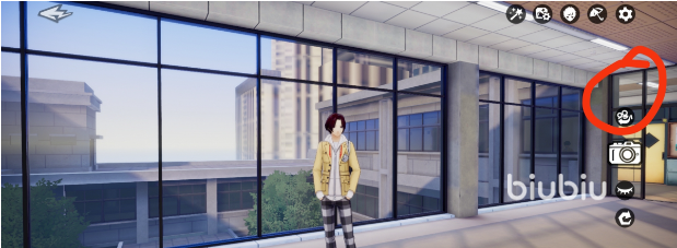 那么具体拍照是怎么玩的呢,在刚进入拍好画面的时候,自己的角色是处于一个固定不动的状态的,在这个时候需要看一下屏幕右边的照相机图标,在照相机图标的上面有一个录像的图标,点击是可以控制人物进行移动的。
