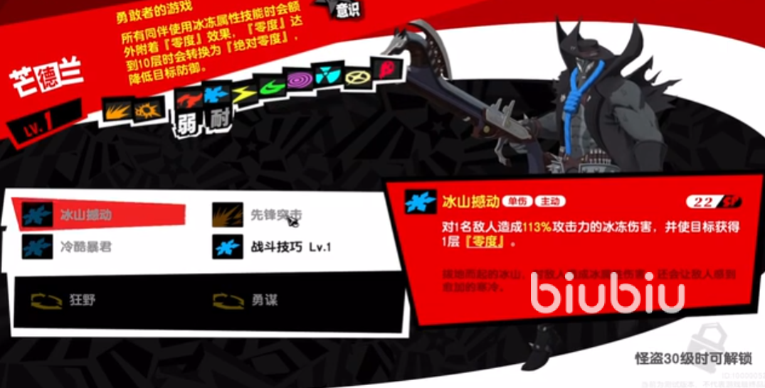 芒德兰这个人格面具的属性是冰,当场上他所有的同伴都使用冰冻属性的技能的时候,可以额外附着“零度”的效果,零度的效果是可以进行叠加的,当这个效果叠加到十层的时候,会转换为绝对零度,从而对目标的防御能力进行降低。