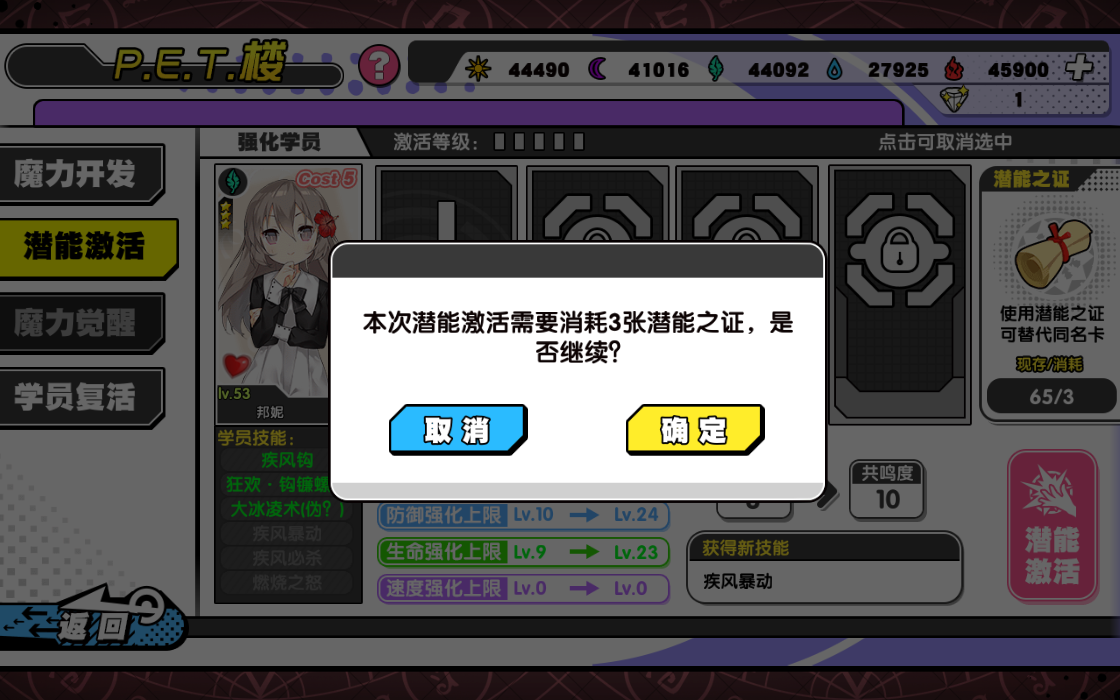 1、角色分解:潜能之证可以通过在源之屋劝退稀有度三星及以上的学员获得,稀有度越高,劝退获得的越多。
