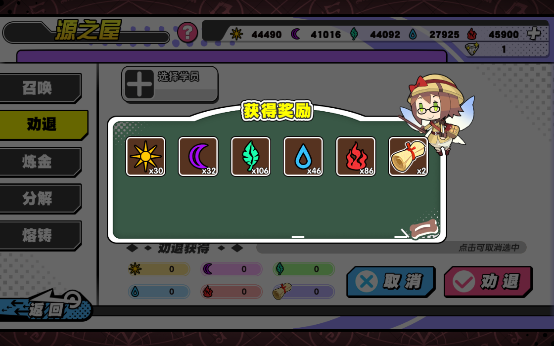 (1)分解获取:这个角色良心支出就在于只要大家有提个极品角色,那么之后进阶的问题就不用愁了。潜能之证可以通过在源之屋劝退稀有度三星及以上的学员获得,稀有度越高,劝退获得的越多。