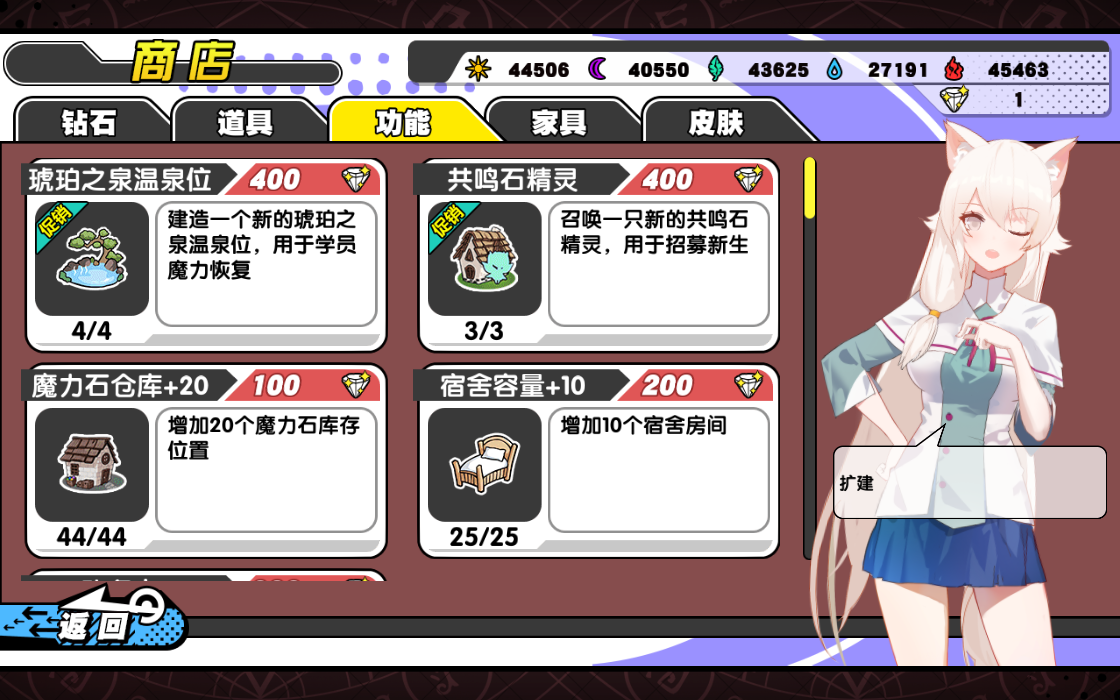 (4)宿舍容量+10:增加10个宿舍房间,售价200钻石。