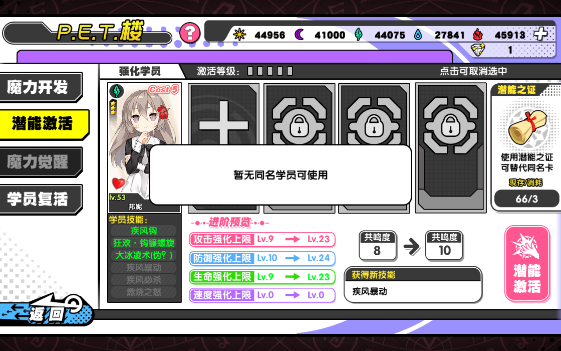 (1)角色进阶:消耗同名角色卡或者潜能之证(可在学员潜能激活时替代一定权重的同名卡的消耗道具,于源之屋劝退3、4、5星级学员时获得)可以进阶学员的潜能等级,这是开启自律技能的必要条件。