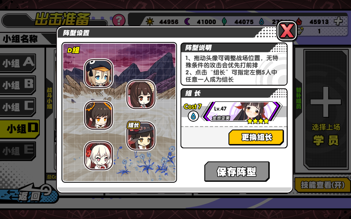 (4)替补学员:替补计入小组总人数,但不获得任何战斗经验;拥有替补技能的学员在这个位置有额外的小组加成每次战斗前均可手动拖拽调整替补。