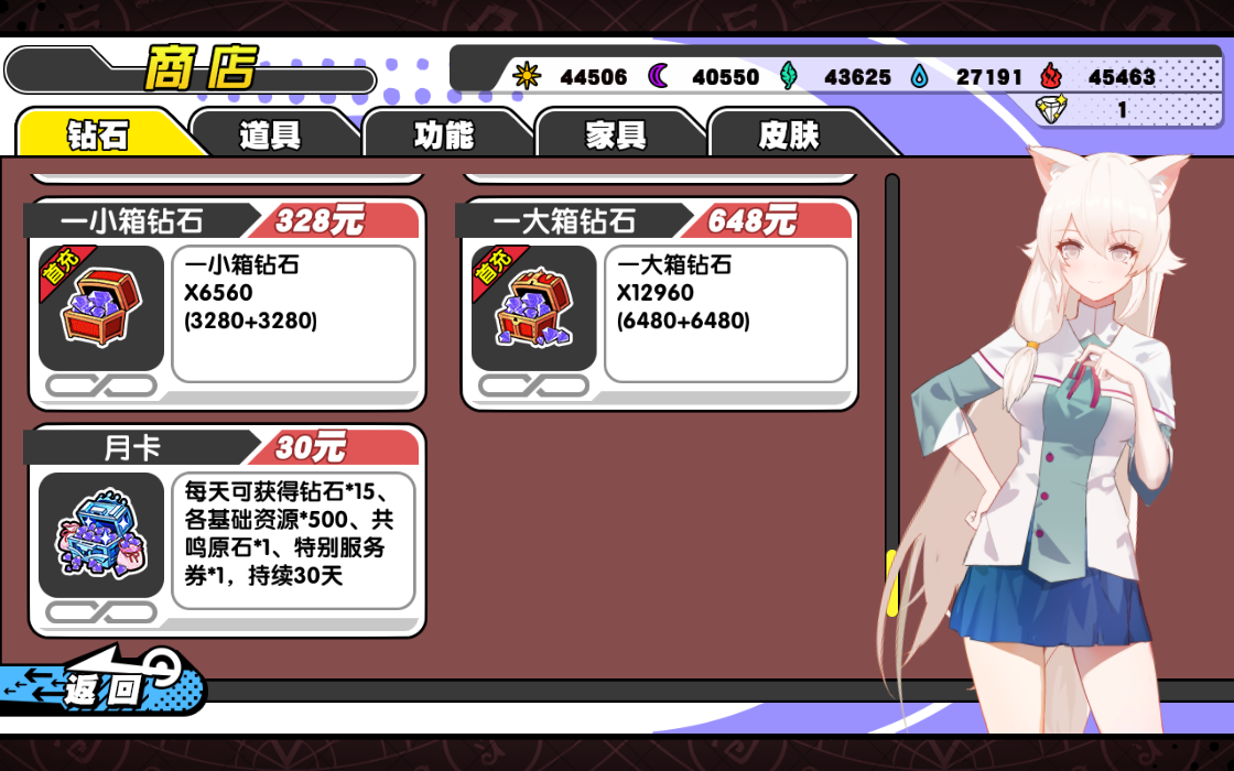 (2)购买月卡:其实这款游戏月卡真的是超值,一张月卡基本就够游戏前期的花费。购买月卡每天可获得钻石15个,各种曜石资源500个、共鸣原石1个、特别服务券1个,持续30天。
