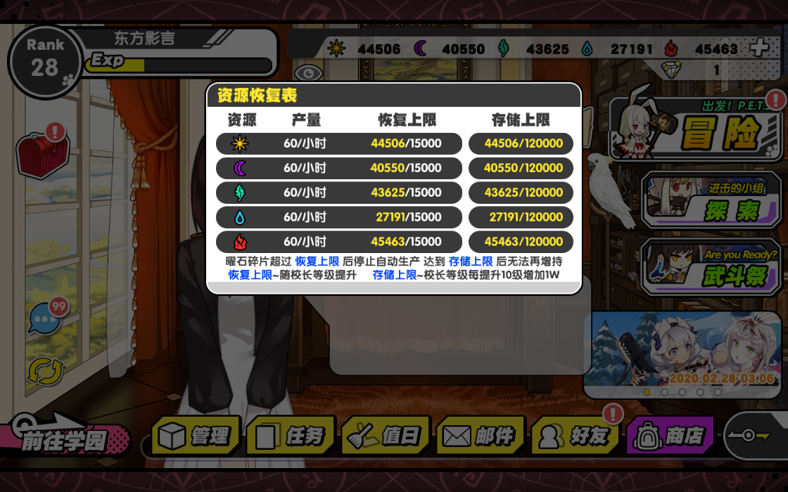 (2)自然产出:曜石随着时间的推移慢慢增加,不过玩家要注意曜石储备的上限。当曜石超过了恢复上限后将会停止自动生产,达到存储上限后无法再增持恢复上限,曜石上限会随校长等级提升 存储上限,校长等级每提升10级增加1w。