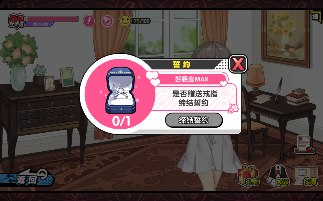 (2)提升好感度:送礼、冒险战斗、成为校长助理均可提升好感度。提升好感度可以解锁匿名信、实名信、支线任务、交互合.....好感度达到200时在宿舍界面使用誓约之戒可以触发誓约事件。