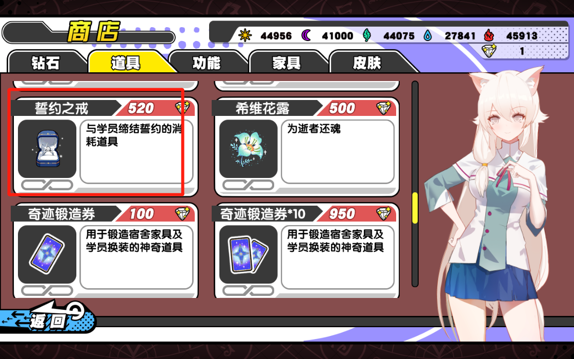 (3)誓约戒指:誓约戒指是潜能角色5的必须道具,该道具只能从商城购买获得。售价520钻石,与学员缔结誓约的消耗道具。