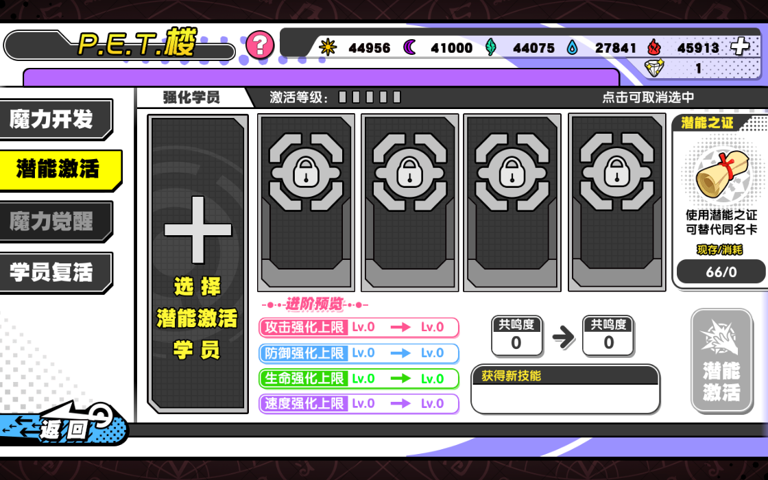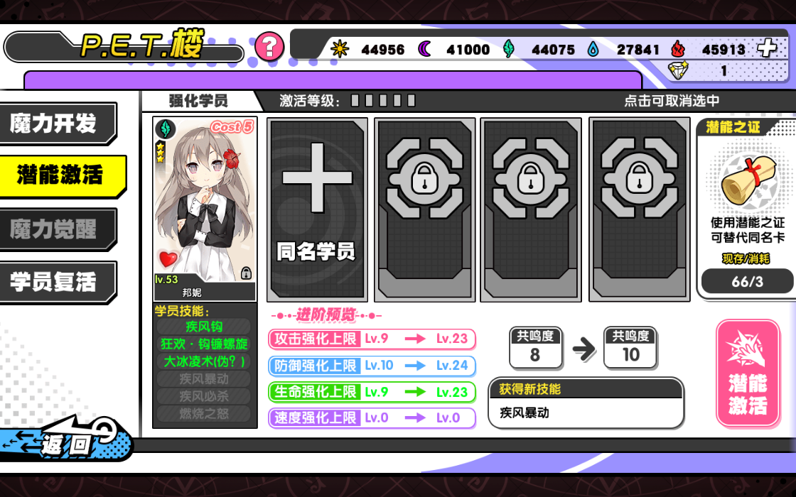 (1)潜能激活:角色在潜能激活5之前要达到潜能激活4,进阶到第四阶段需要消耗同名角色卡或者是潜能之证(可在学员潜能激活时替代一定权重的同名卡的消耗道具,于源之屋劝退3、4、5星级学员时获得)。