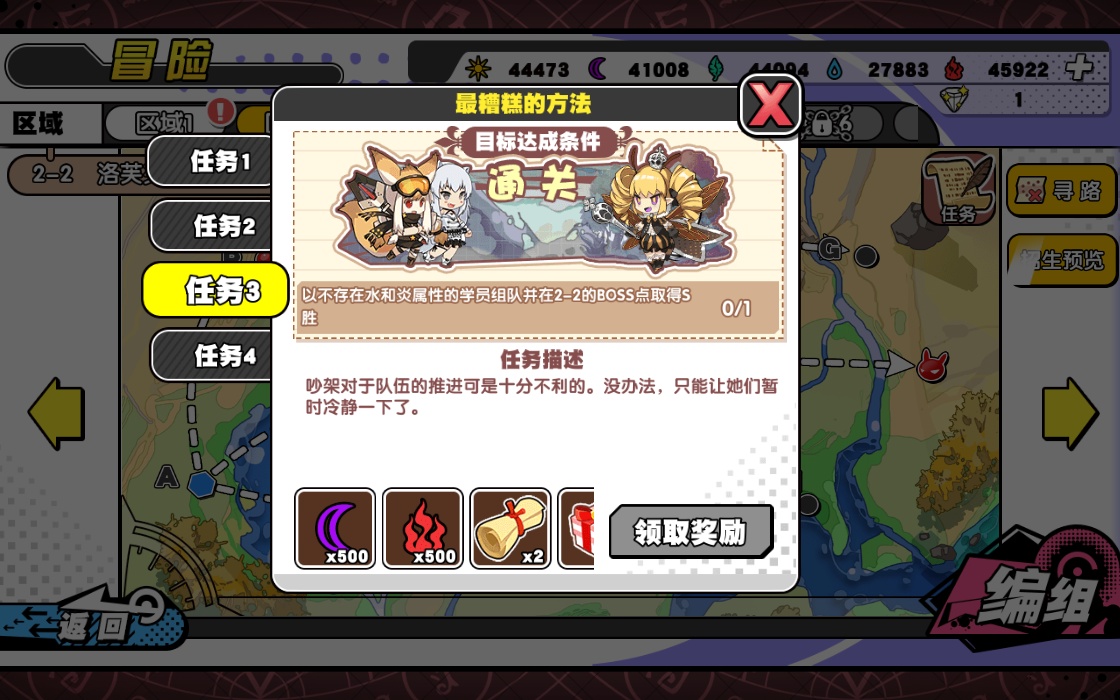 1、任务要求:队伍钟不能存在炎属性的学员,并且在(2—2)关卡的BOSS战斗取得S胜利。