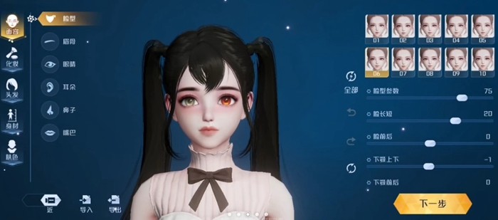 下面小编先为大家分享一套非常不错的女角色捏脸数据。脸型04、脸型参数75、脸长短20、脸前后0、下颚上下-1。眉毛高度设置为-19、眉毛角度设置为-21。眼睛05、眼型参数28、眼睛高度-14、眼间距-3、眼睛突出-6、眼睛大小1。耳朵04、耳型参数75、耳朵大小和角度全部为0。鼻子04、鼻型参数75、鼻子高度1、鼻子前后19。