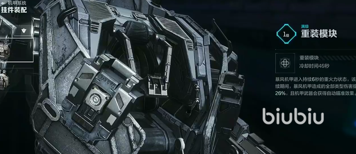 能为机甲带来特殊技能,目前开放的两个模块分别是重装模块和暴风模块。重装模块冷却40秒,开启后6秒内进入重火力状态,伤害提升20%并具备自动瞄准效果,适合打成群敌人时进行爆发清场。而暴风模块冷却35秒,能让机甲在8秒内进入超载状态,行动能量无限、充气次数无限,移动速度额外增加10%,极大提升机动性,尤其适合空中骚扰和持续消耗。玩家可以根据战局需要,灵活选择模块释放时机,往往能成为决定战斗走向的关键。