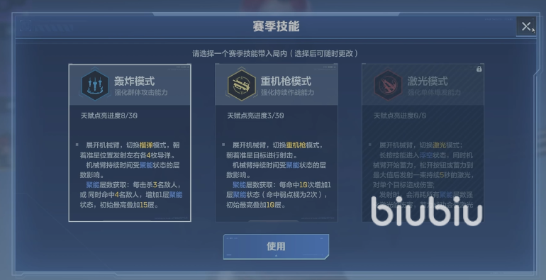 然后是重机枪模式,这个模式能让机械臂切换为重机枪模式,能维持重机枪模式的时间和玩家聚能的层数有关系,在聚能上需要切换为重机枪后命中的次数来聚能,每10个算1层。玩家想要选择这个模式需要有较好的射击能力,还想要刷一刷游戏中各类赛季排名的玩家,就选择这个技能。