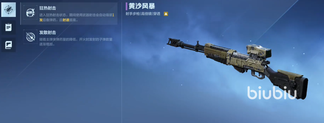 黄沙风暴属于是紫色品质的武器,虽然说比不上金色品质的武器,但是它有着强力的射击能力。在技能上,1技能【狂热射击】,这个技能效果是指武器在进入狂热状态下能自动装1枚子弹,且射击距离较高;2技能【发射射击】,这个技能效果是伴随主弹夹药量数量减少,会增加子弹射击数量。从这些技能上看,不仅很适合喜欢单刷各类副本的玩家,而且还在对战的时候,能针对最后的主体boss有很好的射击效果。